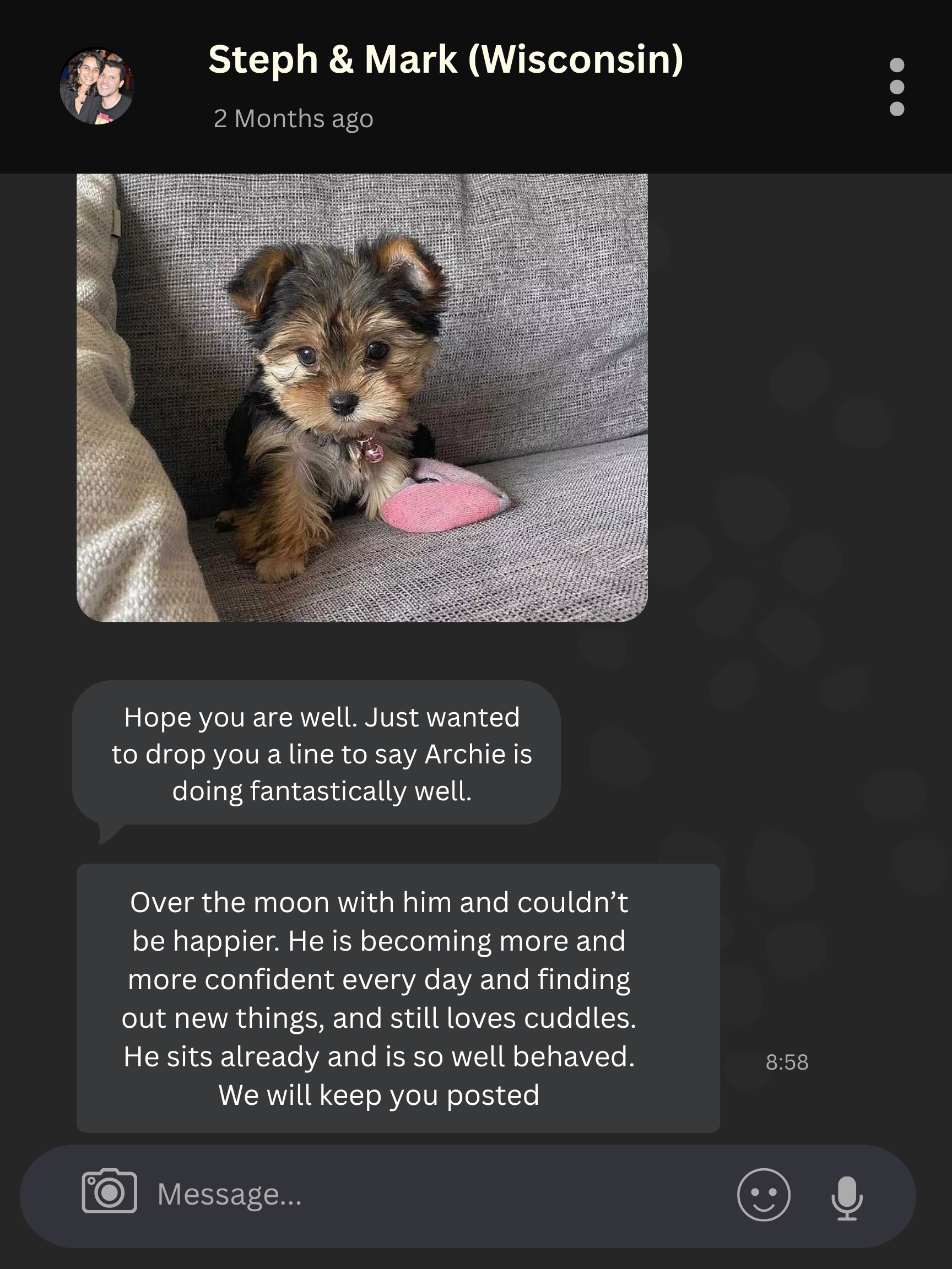 Unlike other breeders who just want to make a sale and then move on with their lives. It is absolutely important to us that our puppies are doing well in their new homes. So, you can always reach out to us if you ever need help with the feeding and basic care. Either by text, call or email. Which ever is most convenient for you.